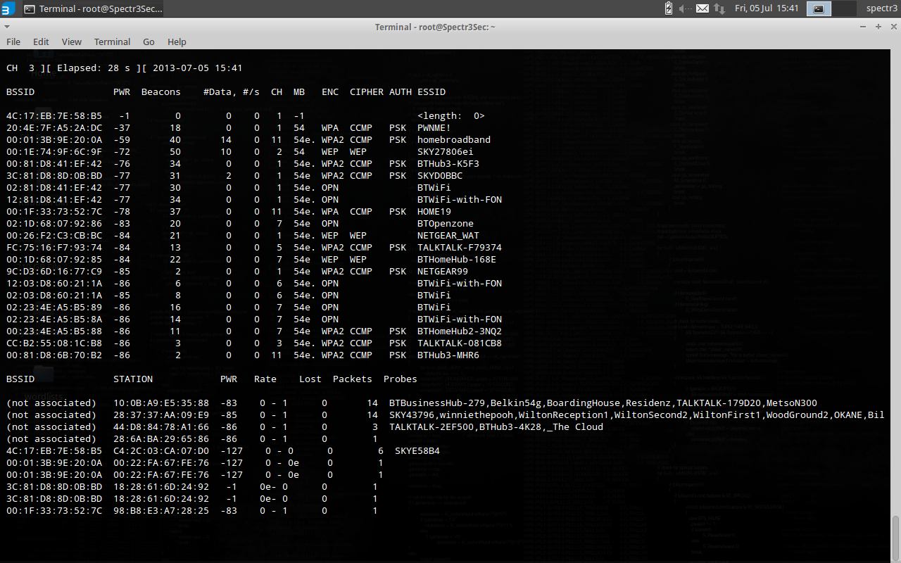 This gives you the total activities in your surrounding including list of APs and the client stations connected to. Using this information you can see how far you are from the router and how far are the clients to you. You can do many things capture live traffic for later analysis, DDos, Harvest data…